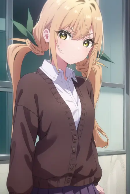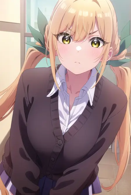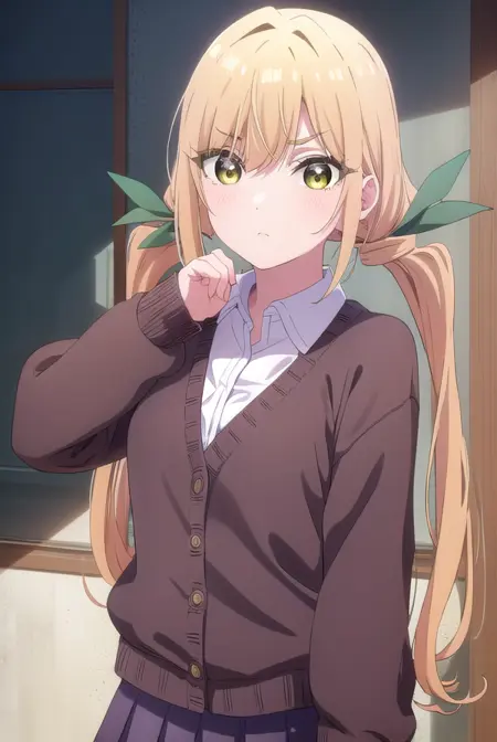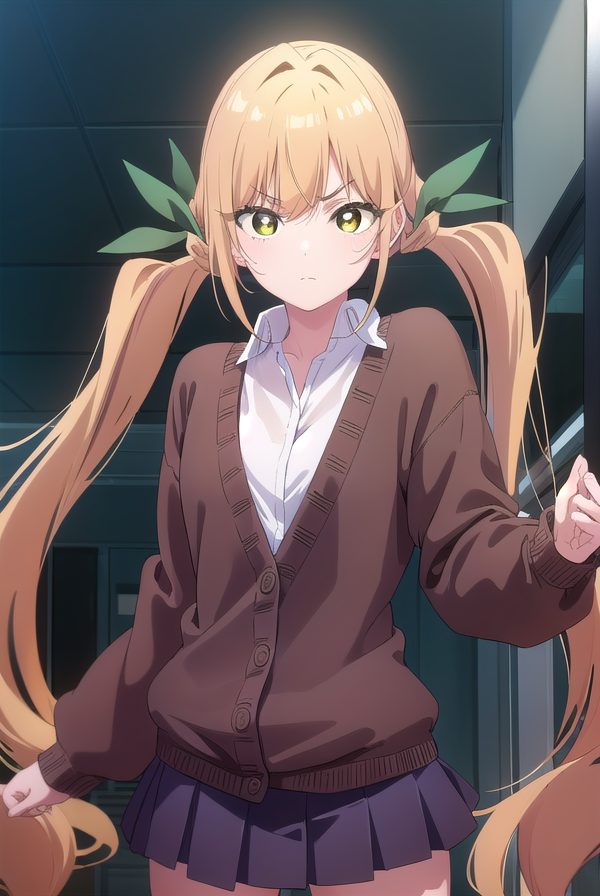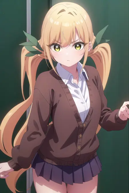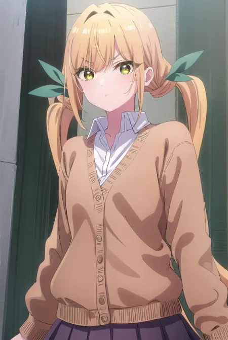 karane inda, blonde hair, (yellow eyes:1.5), hair ribbon, twintails, low twintails, long hair, green ribbon,