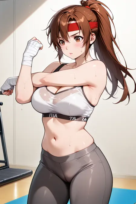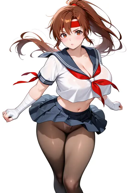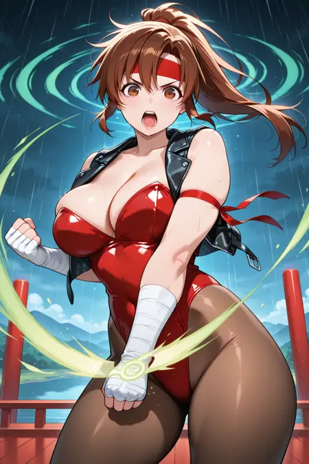棕色头发,长马尾辫,棕色眼睛,红色发带,(红色丁字兔女郎装,低领),红色无肩带紧身衣,(红色臂套:0.8),(无袖黑色机车背心,敞开式),棕色连裤袜,缠手带,(白色宽松袜子,红色匡威鞋:0.8),