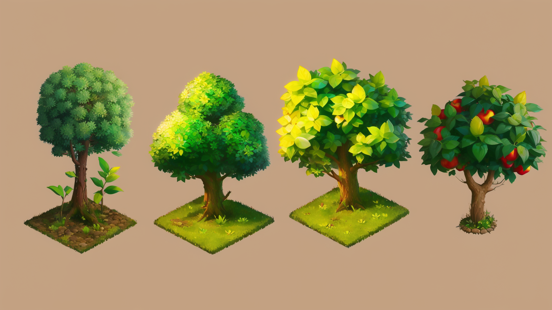 这个植物LoRA涵盖从小型花草、水果、玉米、香蕉,到大型果树、奇形怪状的树木,造型从小到大,充分运用了AI的随机性。