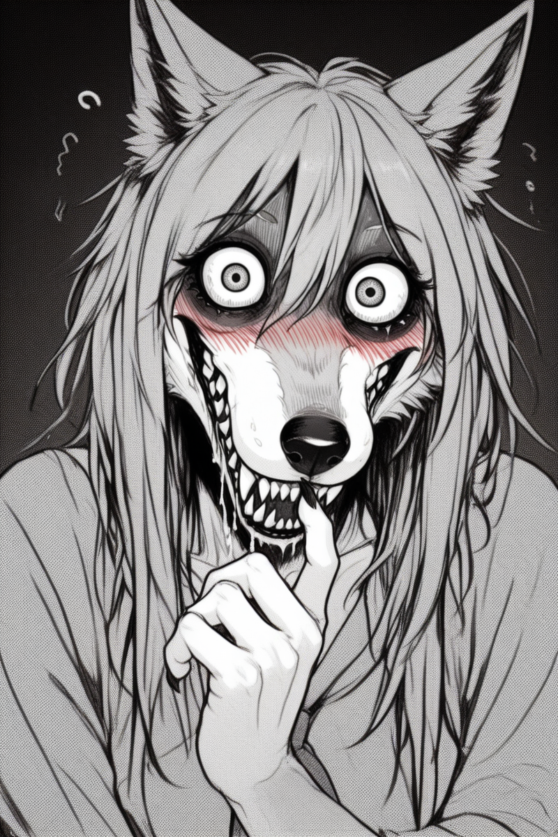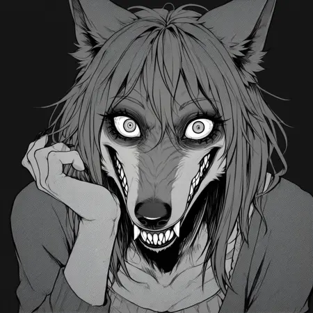 由Junji Ito风格的拟人化狼女疯狂形象制作的LoRA,能很好地为图片添加漫画质感和眼睛的精美戏剧性阴影。