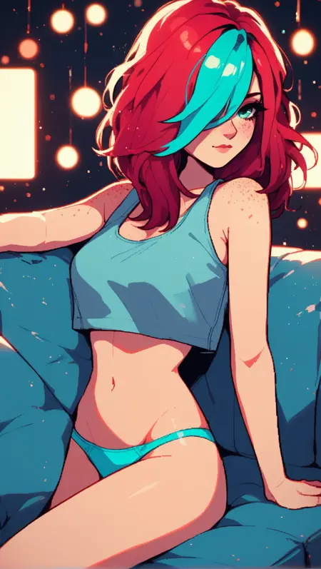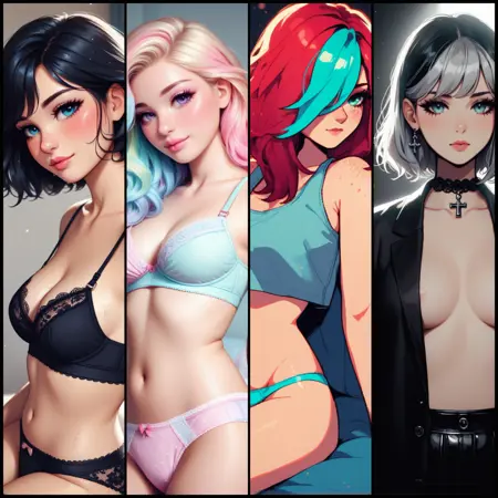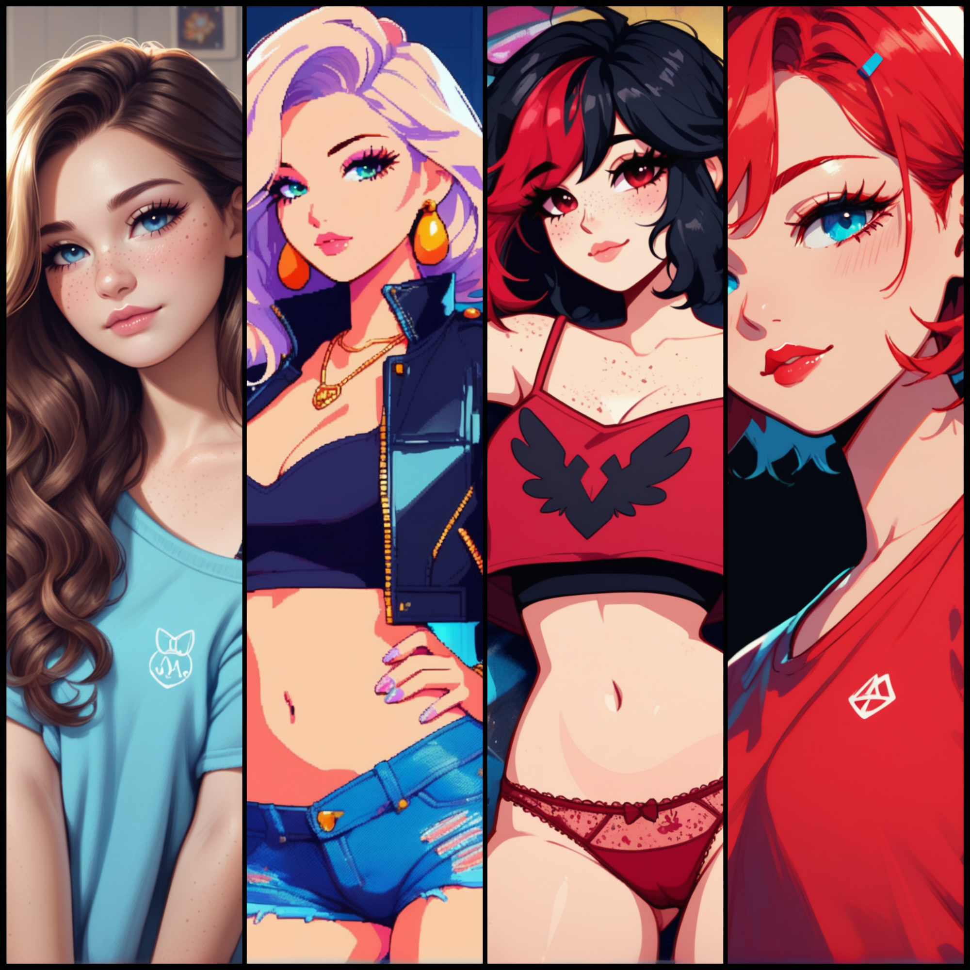 毒性绽放检查点是一个位于后末日巨型城市边缘的超现实之地,霓虹灯光在酸性水洼中倒映,空气中弥漫着人造生命的气息。守卫是拥有鲜艳发色(粉红、青绿、蓝色)的女孩,身着风格化的内衣或紧身短上衣,面容如动漫般精致,眼神充满挑逗。氛围充满强烈对比:可爱与毒性、柔美与危险并存。背景包含霓虹面板、金属墙壁、全息影像,以及在柔和光线中闪烁的湿润表面。