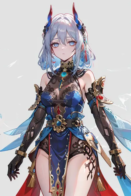 뿔, 팔꿈치 장갑, 다리 문신, 발가락이 드러난 신발