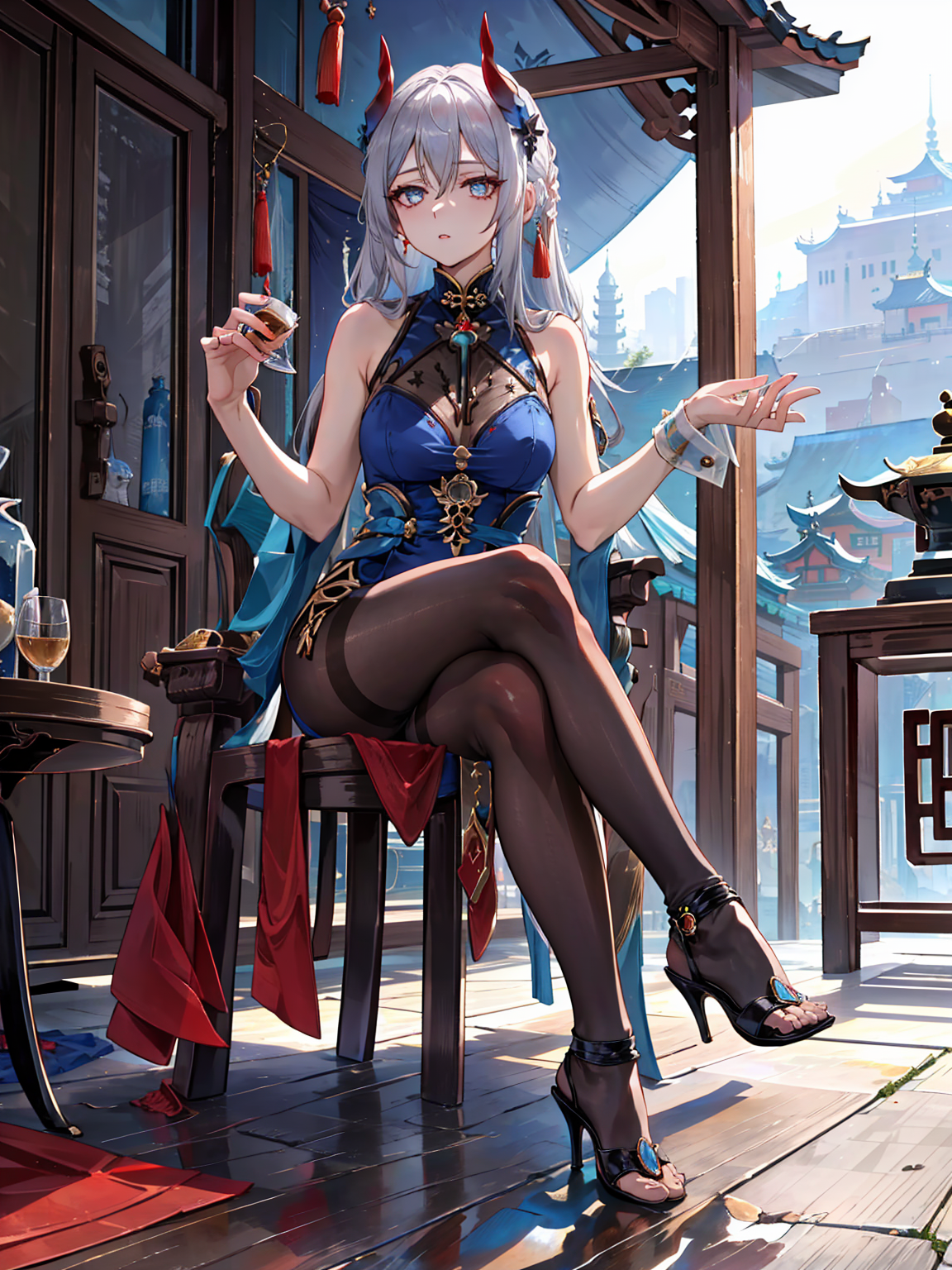 horns, elbow gloves, toeless footwear