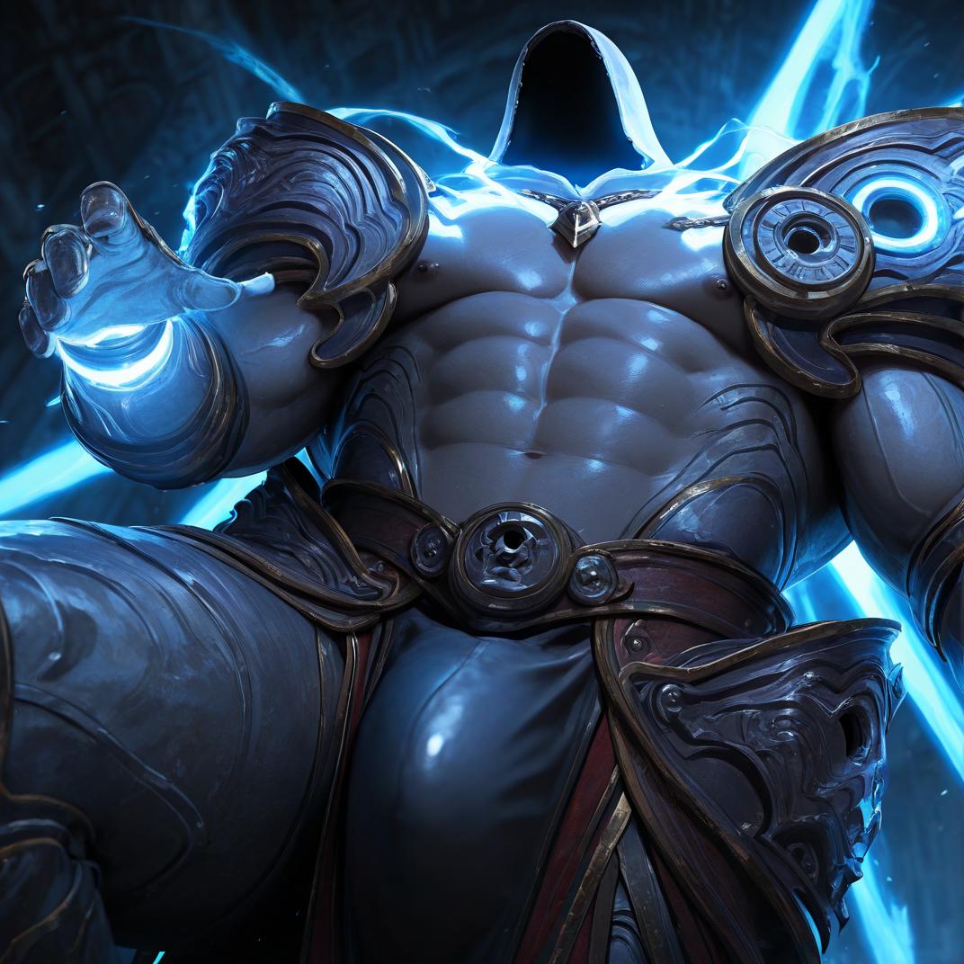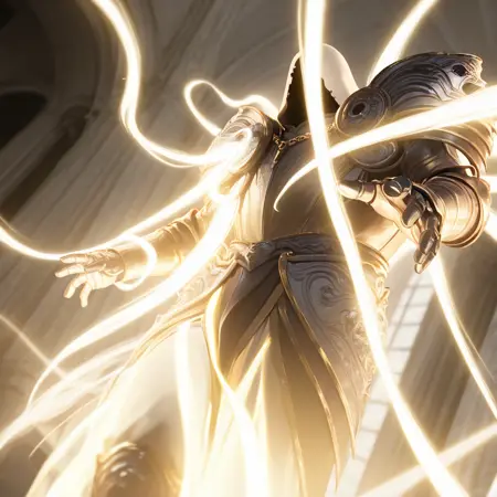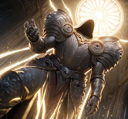 (((男性))),斗篷下隐藏着神秘的黑色无面无头身影,银色基底,点缀深 crimson 与浓郁金色细节。铠甲配有华丽的肩甲,手臂和腰部雕刻有复杂纹路。从背部延伸出由Inarius构成的流动金色光芒骨骼触须翅膀,由修长的骨结构组成,包裹在空灵的白色与金色光芒中,发光的能量丝线在每根骨骼间交织,形成对称结构。肩甲、装饰性腰饰、分段胸甲、金色链式项链、铠甲手套、胫甲、护腿、铠甲,以及铠甲上的划痕,