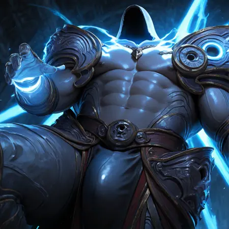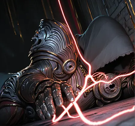 (((male))),hood with mysterious black faceless and headless figure underneath, silver with deep crimson and rich gold accents. The armor features ornate shoulder plates and sculpted details on the arms and waist showcasing intricate patterns. Flowing gold radiant skeletal tentacle wings of Inarius composed of elongated bone structures wrapped in ethereal white and gold light with luminous energy tendrils arcing between each bone forming a symmetrical from his back, pauldron, ornamental waist drape, segmented chest plate, gold chained necklace, armored gauntlets,sabatons,greaves, armor, scratches on armor,