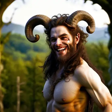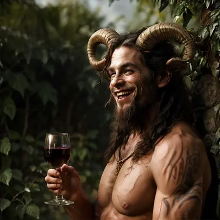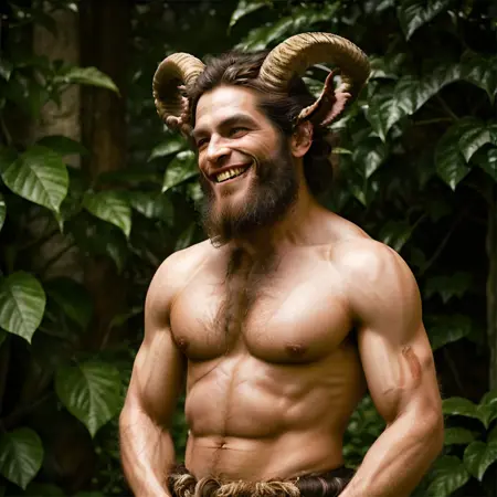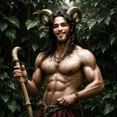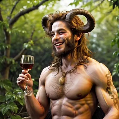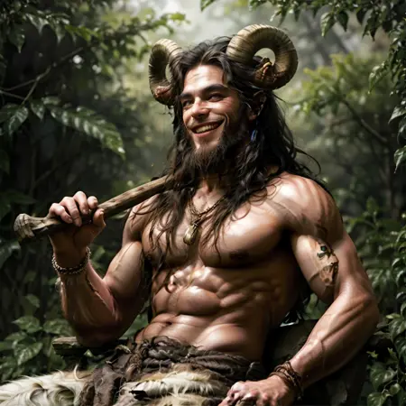 1boy, animal ears, arm tattoo, beard, belt, black hair, blonde hair, blood, blurry, blurry background, bracelet, braid, brown hair, chest hair, chest tattoo, closed eyes, cup, curled horns, dreadlocks, drinking glass, earrings, facial hair, flute, full body, fur, fur trim, goat horns, grin, hairy, holding, holding bottle, holding cup, holding instrument, hooves, horns, instrument, jewelry, long hair, looking at viewer, male focus, manly, multiple boys, muscular, muscular male, mustache, navel, necklace, old, old man, open mouth, playing instrument, pointy ears, realistic, satyr, sheep ears, sheep horns, sitting, smile, solo, spear, staff, standing, tail, tattoo, teeth, thighs, tooth necklace, weapon, wine, wine glass,