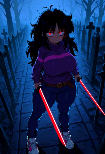 1girl, 红眼, 眼下有黑眼圈, 三白眼, 瞳孔竖线, 长发, 黑发, 凌乱头发, 天线辫, 刘海, 巨乳, 宽臀, (粗大腿:1.2),