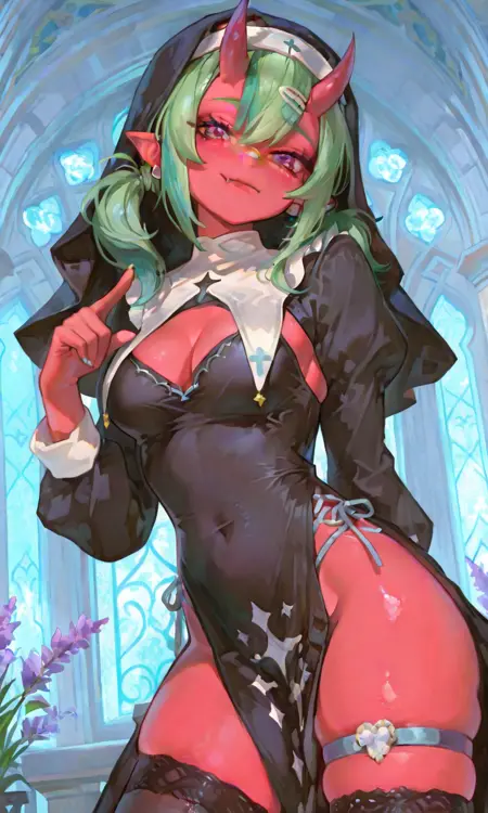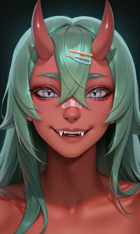 标志性特征:两只小弯角,鼻子上贴着创可贴,短而尖的耳朵,浅蓝色珍珠耳环,尖锐的獠牙,多色眼睛,薰衣草色与浅蓝色渐变