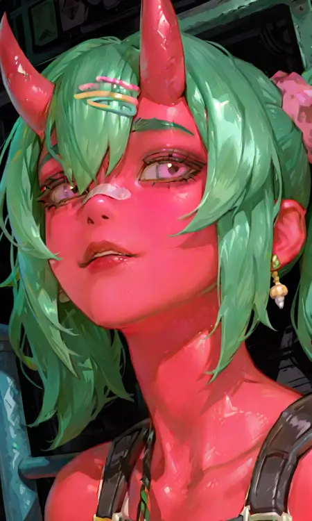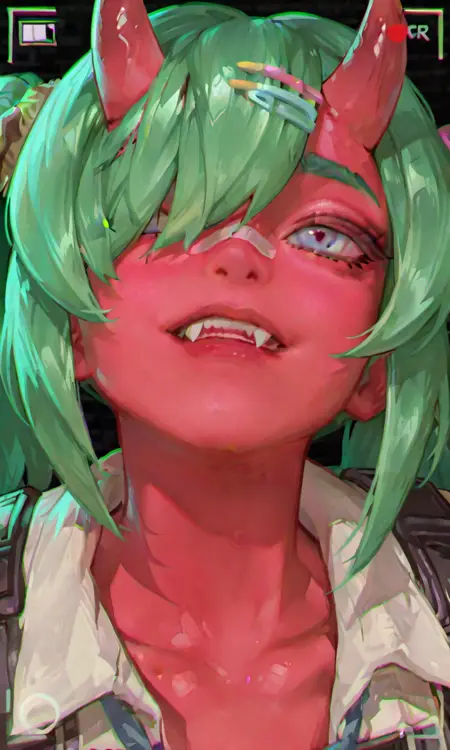 头发:绿色头发,扎成两条马尾,刘海位于双角之间,脸颊周围有发丝,佩戴淡彩色发夹