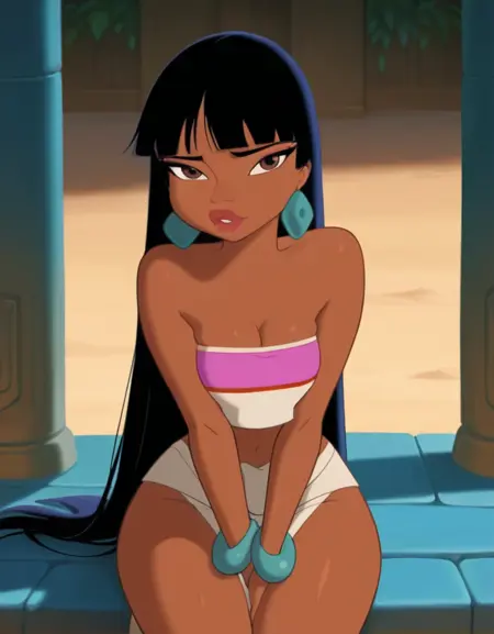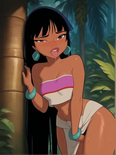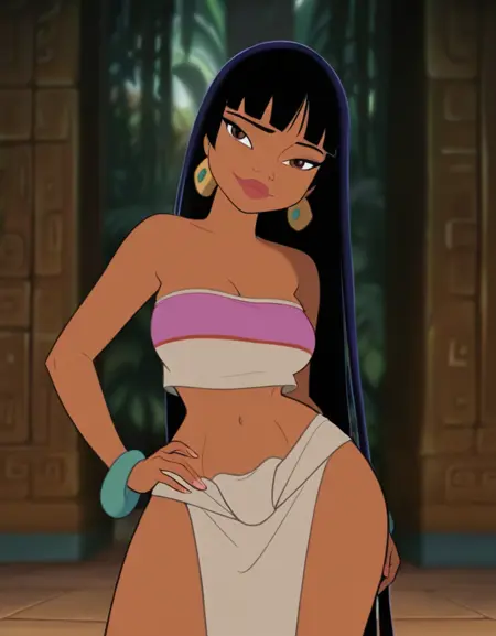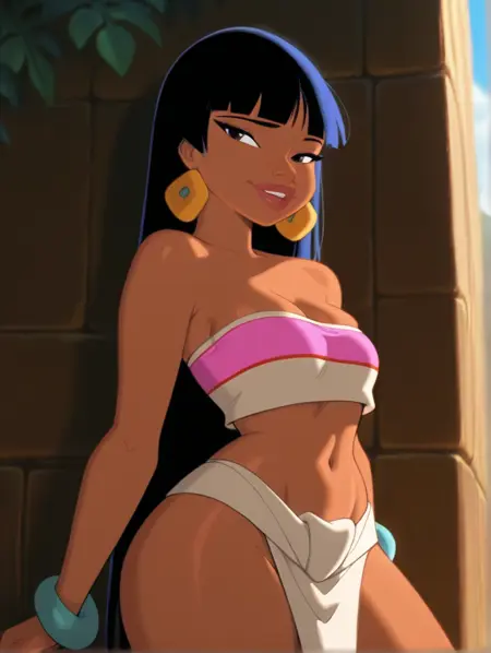 深色皮肤女性,棕色眼睛,长发,黑发,刘海,嘴唇,金色耳环,手镯,露脐上衣,腰布,胯部垂帘,腹部,肚脐