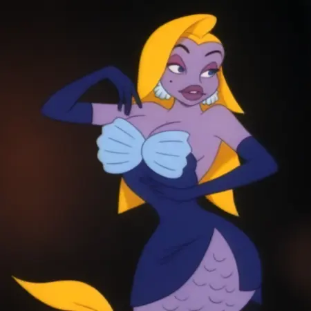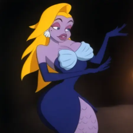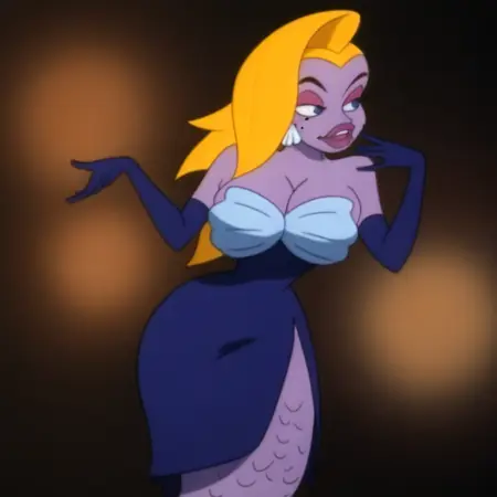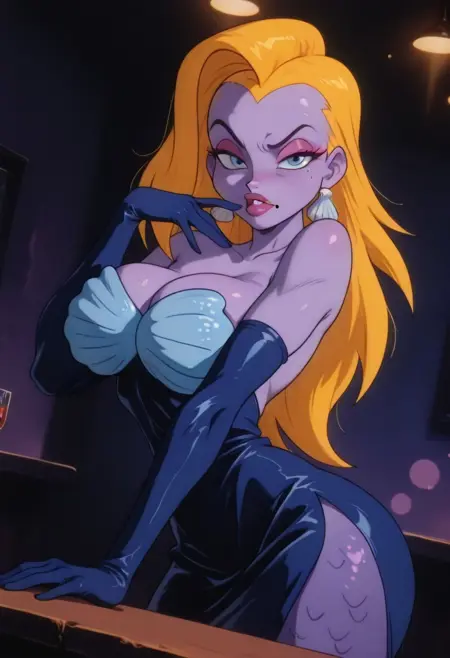 AngelJonesFP, 1소녀, 솔로, 몬스터 소녀, 인어, 물고기, 색깔 있는 피부, 보라색 피부, 금발, 긴 머리, 파란 눈, 아이섀도우, 두꺼운 입술, 얼굴에 점, 메이크업, 껍질 귀걸이, 큰 가슴, 어깨 드러난, 검은 파란색 컷아웃 드레스, 스트랩 없는 드레스, 흉부 노출, 파란색 팔꿈치 장갑, 사이드 슬릿, 물고기 꼬리, 지느러미,