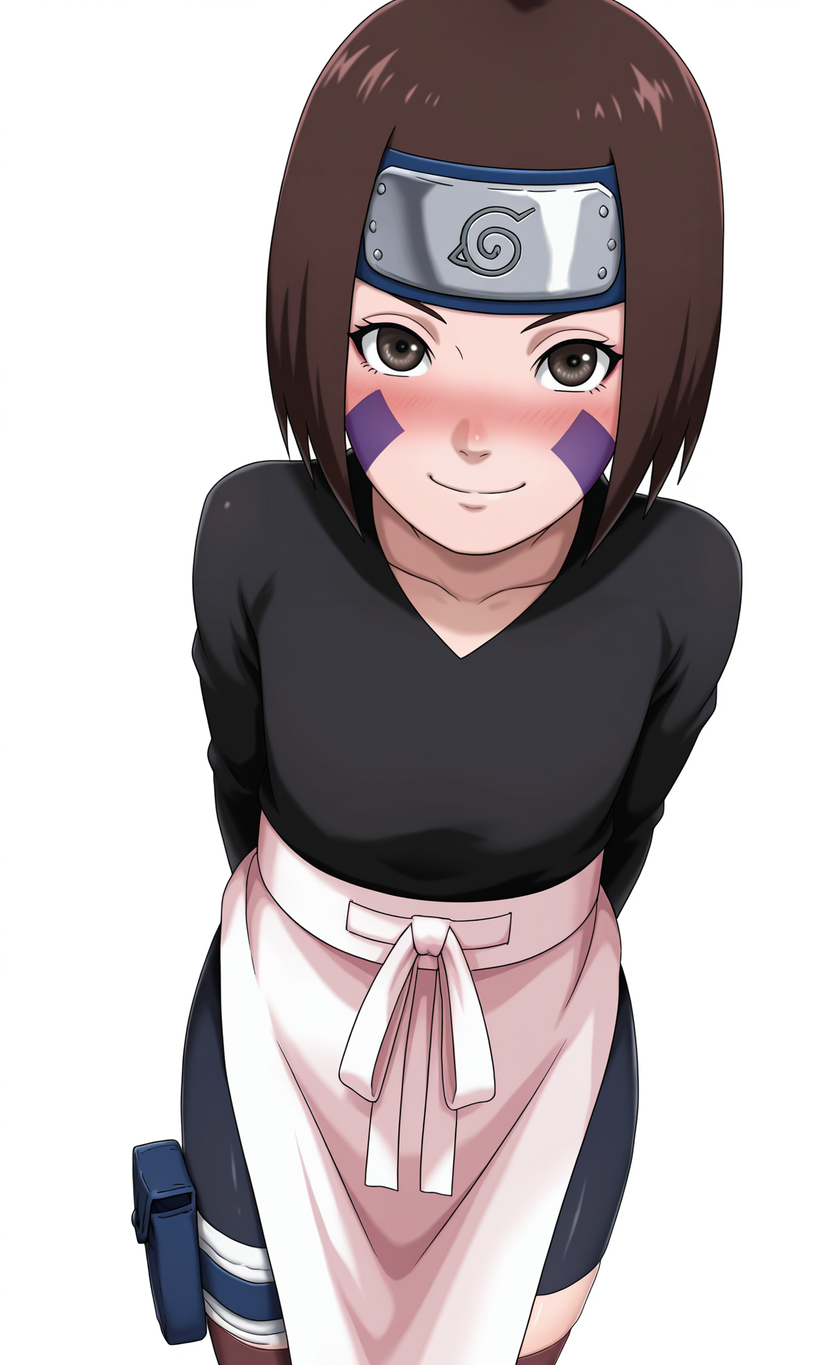 konohagakure symbol, forehead protector, black shirt, waist apron, bracelet, bandaged leg, black shorts, thigh pouch, red stockings, toeless footwear,