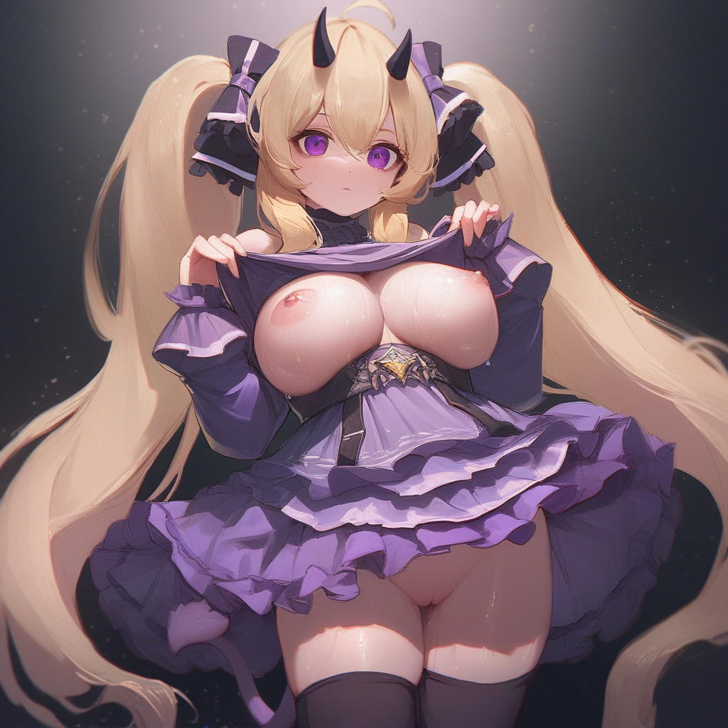 (VTuber_Cerber, purple eyes, long hair, twintails, blonde hair, bangs, hair between eyes, hair bow, horns, tail, dress, thighhighs),