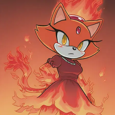 Burning blaze, red fur, red tail with red fire tip, red dress