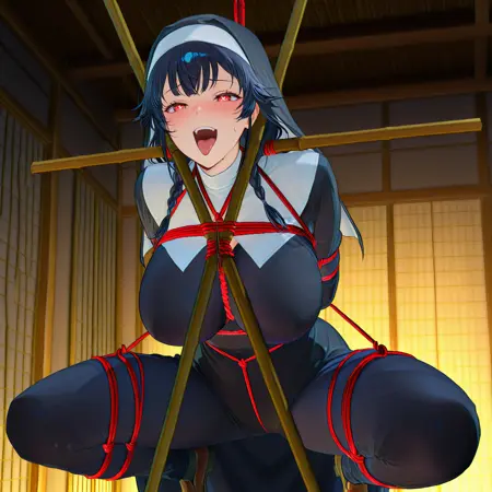 BambooNeckLock, shibari, 腕を背中に回して、赤いロープ、茶色の竹の棒、縛られた状態、脚を開いた、正座