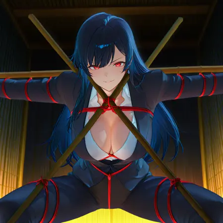 BambooNeckLock, shibari, 腕を背中に回して、赤いロープ、茶色の竹の棒、縛られた状態、脚を開いた、(腕を広げた:1.3)