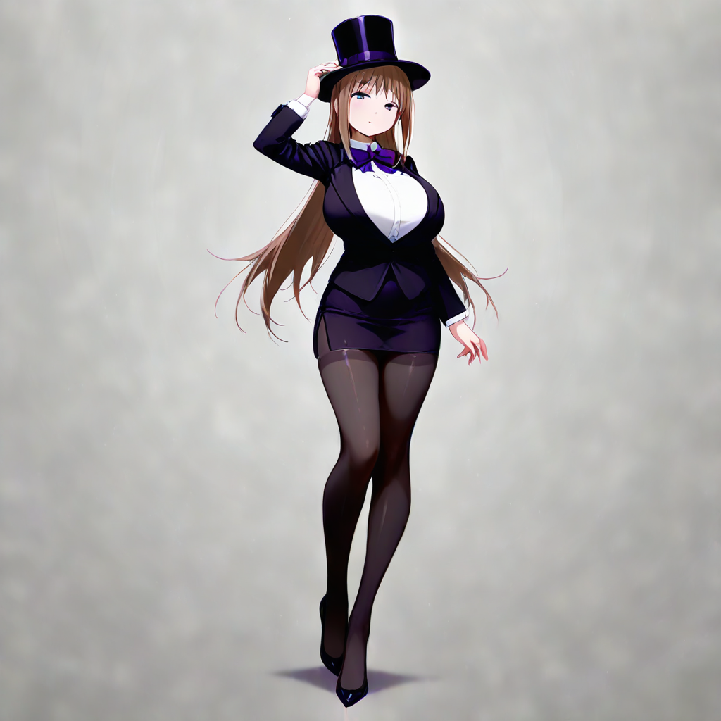 gigantic breasts, a black silk top hat, brown hair, long hair,, sidelocks office lady, side slit,pencil skirt, long sleeves, suit jacket, bowtie, black pantyhose, thighband pantyhose,high heels