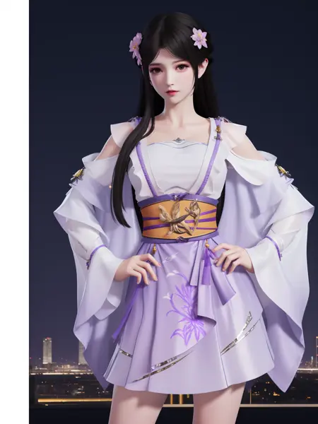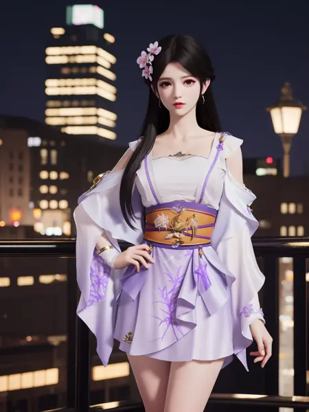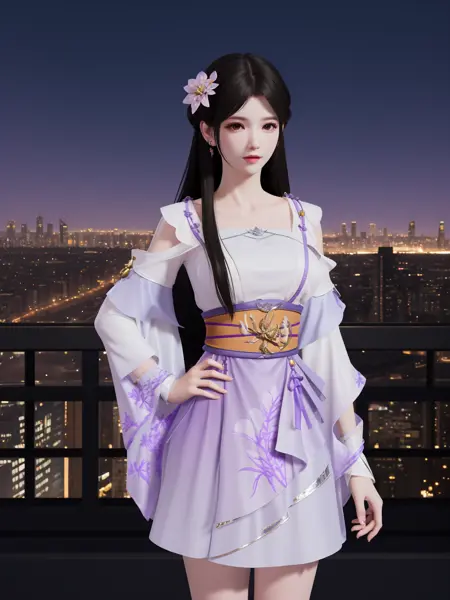 - YJWJyingzipingRYLSpurple,1girl,solo,long hair,sash,hair flower,black hair,obi,cityscape,night,looking at viewer,mature female,hand on hip, bent over,