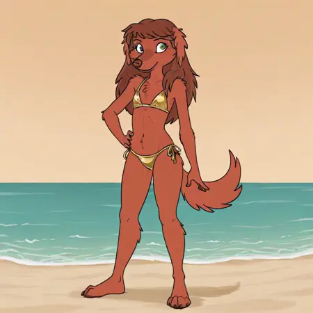 dog girl, Irish setter, red fur, brown hair, long hair, green eyes, brown nose, dog ears, dog tail, flat chest,
