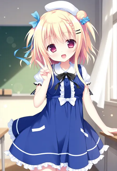 white beret,blue dress,puffy short sleeves,frilled dress,white shirt,center frills,white frills,black bowtie,collared shirt,frilled sleeves,white bow,