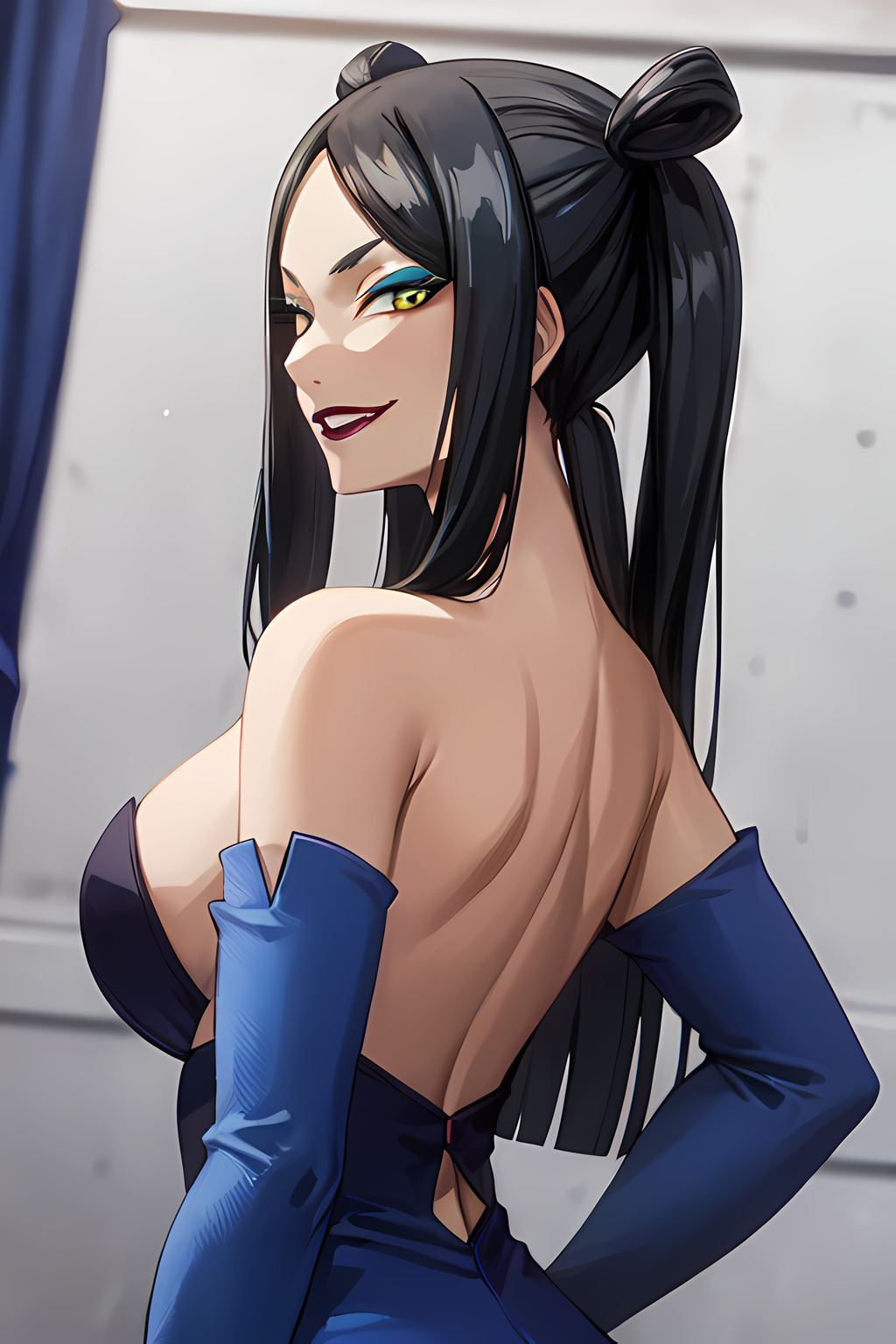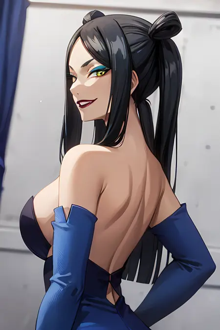 minervaorland, blue dress, makeup, eyeshadow, red lips, elbow gloves, blue gloves, side slit - outift that Minerva is wearing when she first appears on GMG.