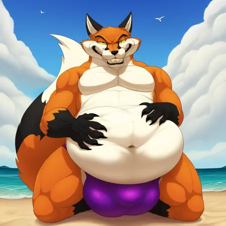 kuuhun, kuufuku, hungothenomster, ファリー男性, 黄色い虹彩, 黒い目, 筋肉質な男性, オレンジ色の毛, 爪, 胸筋, 太い太もも, 狐の尾, 尖った歯, 狐の耳, 狐の少年, へそ, 黒い爪, ひげ, 白い毛, 黒い毛, 茶色の肉球, 体毛, 半分閉じた目