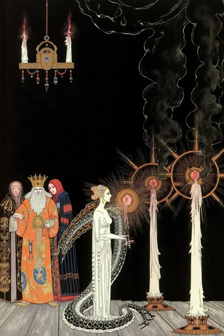 收录经典童话,展现优雅修长的人物形象与流畅的洛可可风格细节。《太阳之东,月亮之西》(1914年):