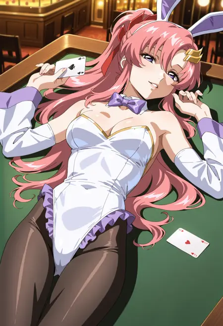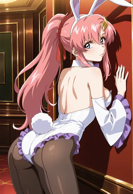 Lacus Clyne バニー版:lacus_c, 1girl, アニメ風カラー, レトロなアートスタイル, シングル, 長髪, ポニーテール, ピンク髪, 目の間の髪, 髪飾り, プレイボーイ髪リボン, 赤いリボン, 紫の目, lacus プレイボーイバニー, 兎の耳, 白いストラップレスレオタード, フリル付きレオタード, 肩出し, 紫のボウタイ, 外側のカラー, 外側の袖, 長い袖, 兎の尾