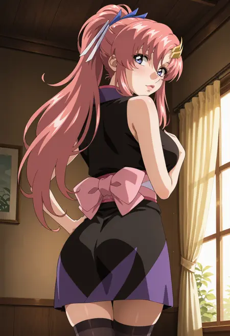 Base: lacus_c, 1girl, anime coloring, retro artstyle,solo, long hair, pink hair, high ponytail, hair ornament, hair ribbon, hair between eyes, purple eyes, lips, lipstick, black sleeveless kimono, sash, black thighhighs, medium breasts,