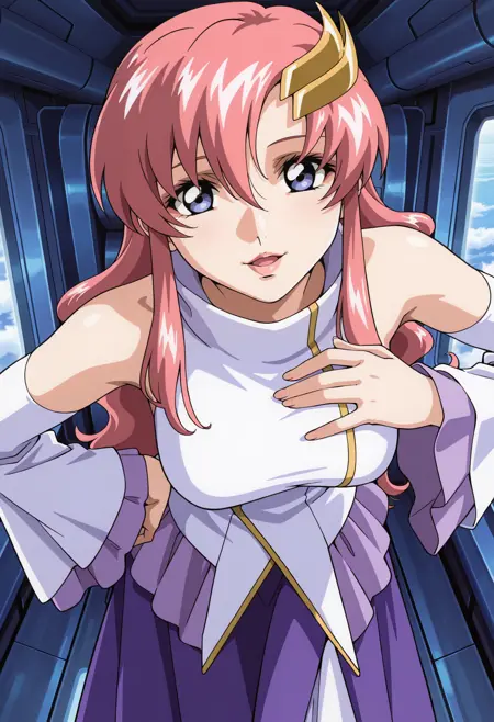 Seed S1 Dress: lacus_c, 1girl, anime coloring, retro artstyle,solo, long hair, pink hair, hair between eyes, purple eyes, lips, lipstick, lacus white dress, turtleneck,bare shoulders, detached sleeves,purple skirt, lacus long skirt, medium breasts,