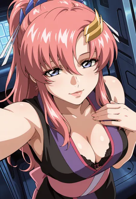 Pilot suit: lacus_c, 1girl, anime coloring, retro artstyle, solo, long hair, high ponytail, pink hair, hair ornament, hair between eyes, purple eyes, lips, lipstick, lacus pilot suit, pink white bodysuit, pilot gloves, shoulder armor, pilot boots, high heels, medium breasts,