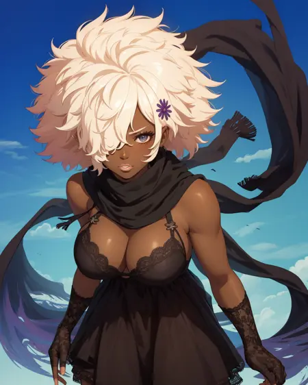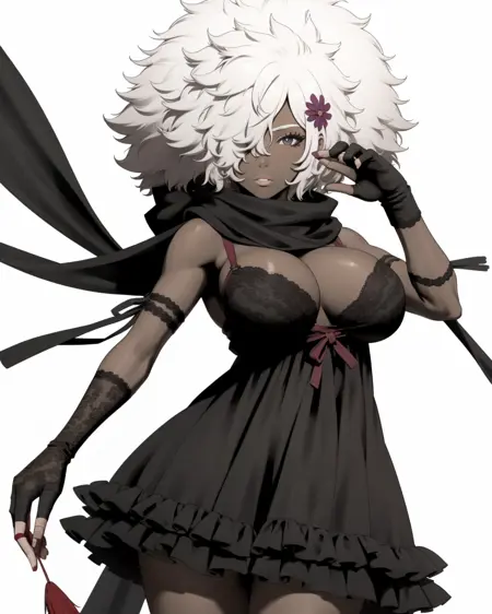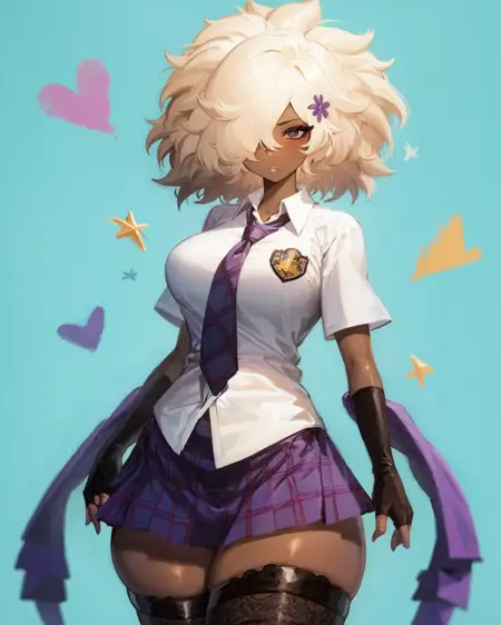 来自《无更多英雄》系列的Shinobu Jacobs。为每款游戏中的服装标记为NMH1、NMH2、NMH3,但由于大部分艺术作品都是她穿黑色连衣裙的形象,其他两种服装的呈现较弱。你可以尝试提示校服,但想触发她NMH3的装扮可不容易。