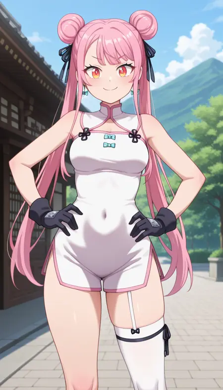 衣装: ボウイアリング、中国風衣装、ノースリーブ、ドレスのボウ、おへそカバー、ブラックハーフグローブ、非対称な脚部装飾、片方の thighhigh、ホワイトthighhigh、ホワイトkneehigh、ブラックシューズ