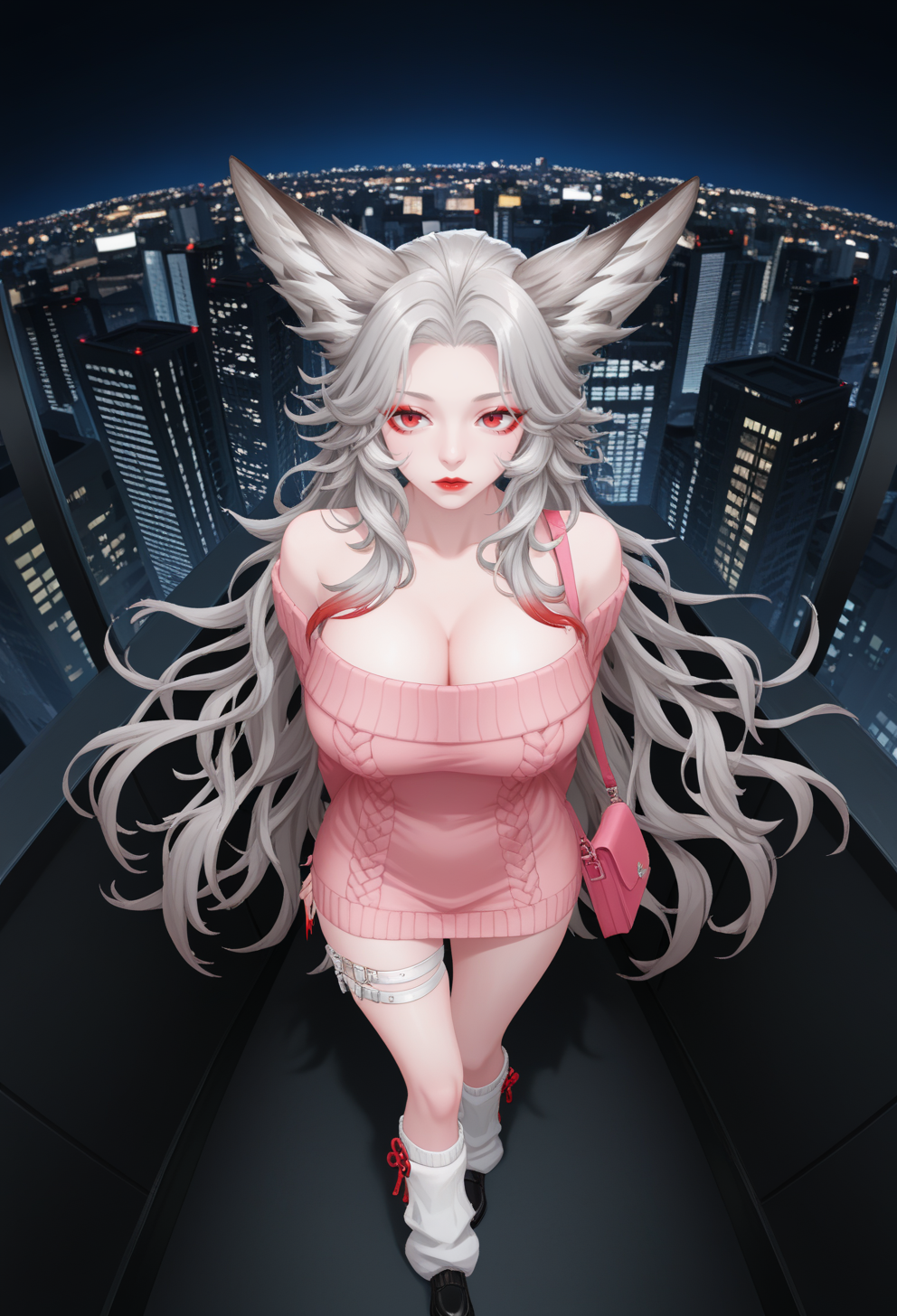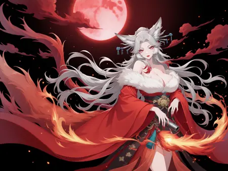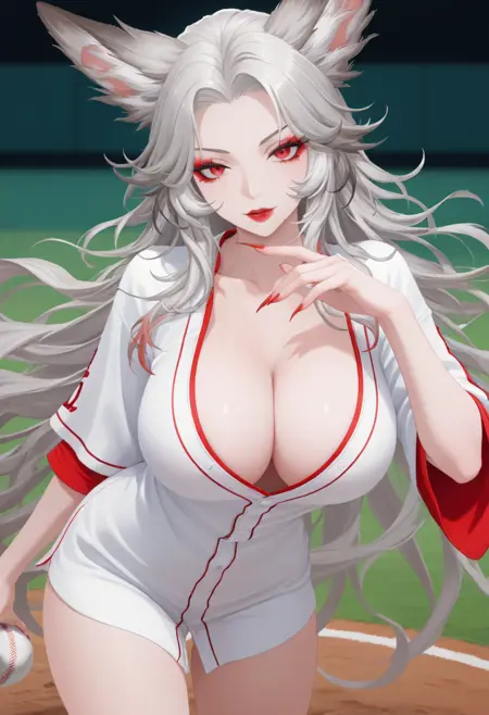 게임 내 옷을 입지 않는 프롬프트: swh, huge filesize, wide sleeves, white hair, very long hair, sharp fingernails, red nails, red lips, red eyeshadow, red eyes, makeup, long hair, long fingernails, large breasts, animal ears, grey hair, fox girl, fox ears, fingernails, eyeshadow, cleavage, breasts,