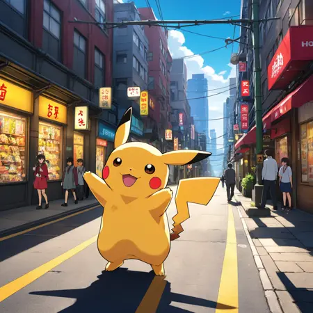 photo of an anime pikachu playing basketball in a realistic wordon, a closed laptop on a desk, detailed background