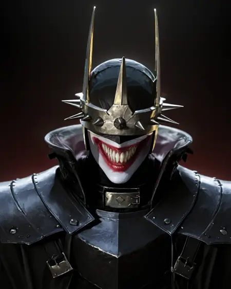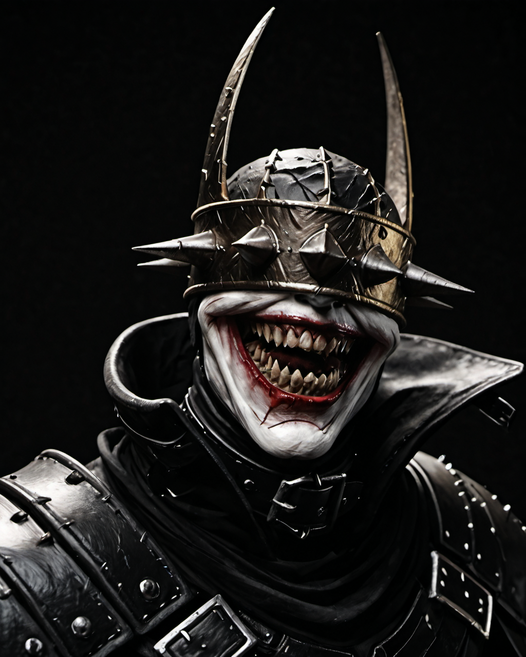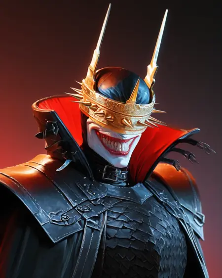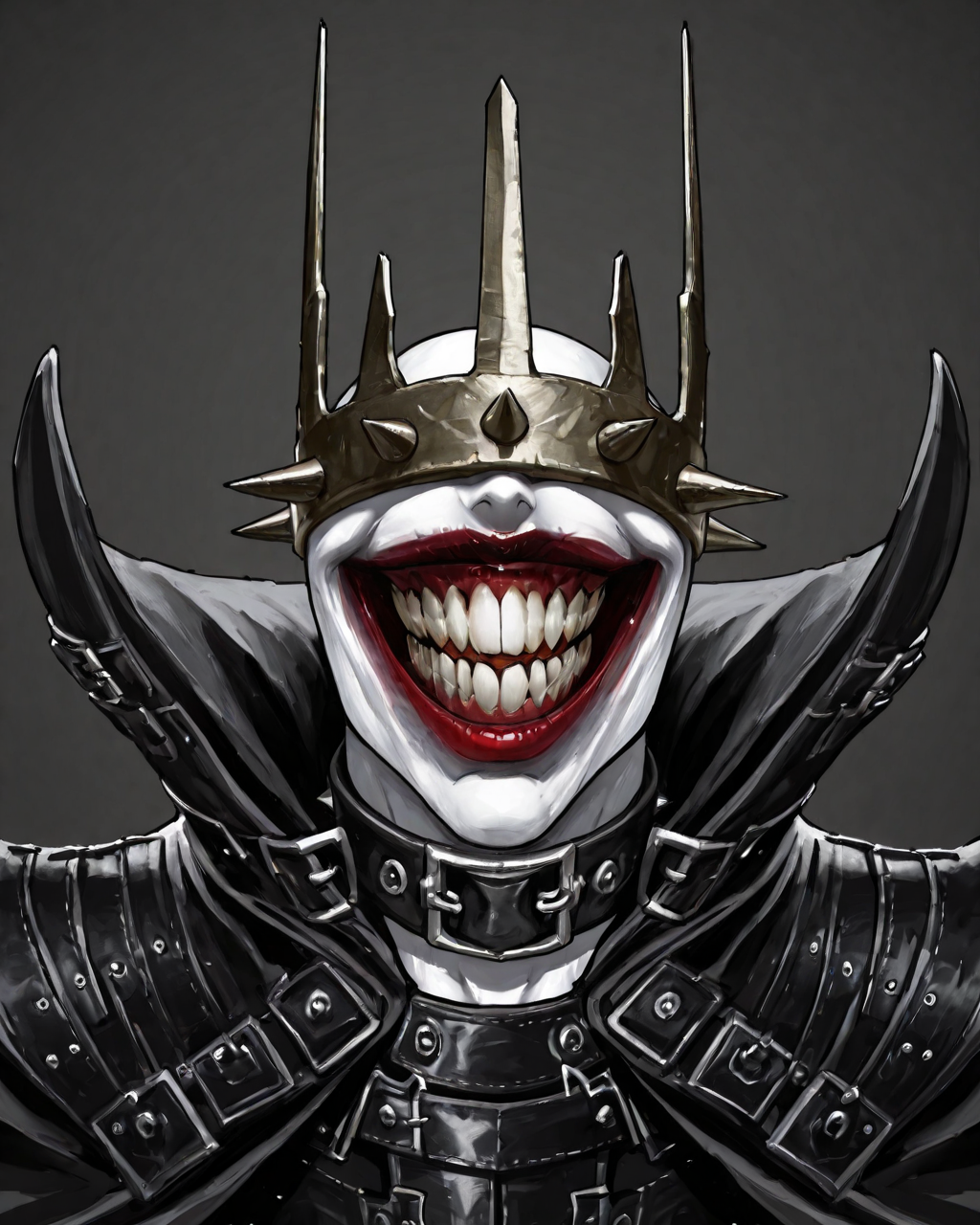 white skin, armor, crown, metal crown, black cape, red lips, no eyes, teeth,collar,