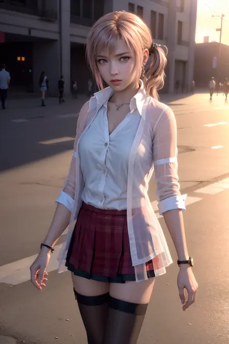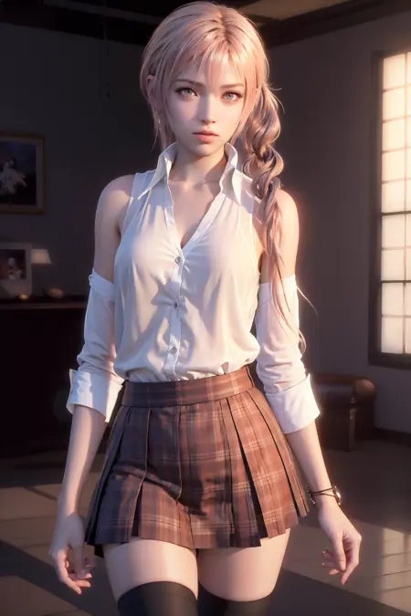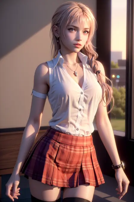 彼女のオリジナルの服を再現したい場合は、以下のトリガーワードを使ってください:黒いレッグウェア、チェック柄のシャツ、スカート、シンハイズ。