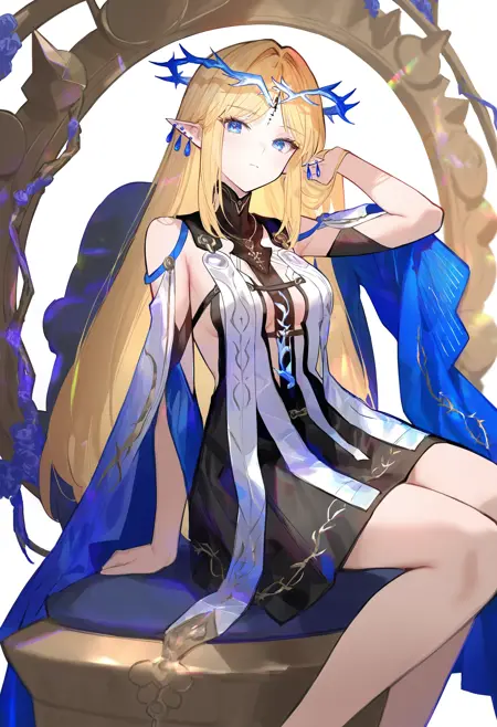 cartethyia \(wuthering waves\),1girl,solo,looking at viewer,pointy ears,blonde hair,long hair,jewelry,earrings,blue eyes,crown of thorns,dress,standing