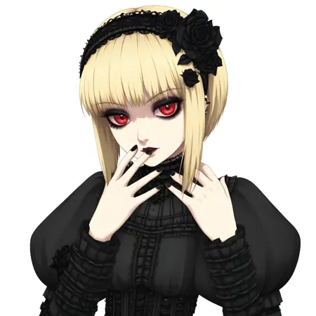 1소녀, 혼자, 니논 베아르, 검은 손톱, 붉은 눈, 단발, 곧은 앞머리, 고딕, 금발, 머리에 검은 꽃, 검은 헤어밴드, 검은 입술, 검은 드레스, 긴 검은 부츠, 긴 소매, 풍선 어깨, 긴 드레스, 검은 팬티스타킹.