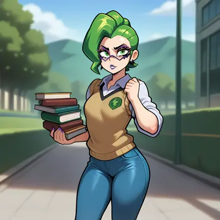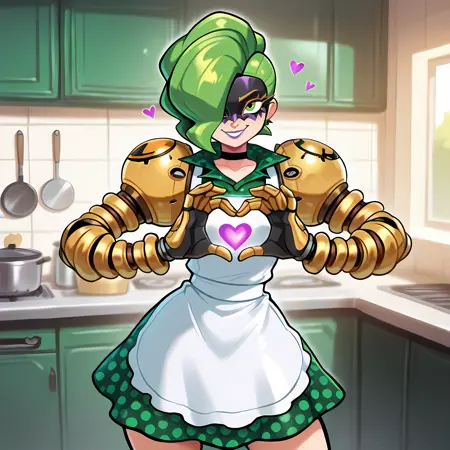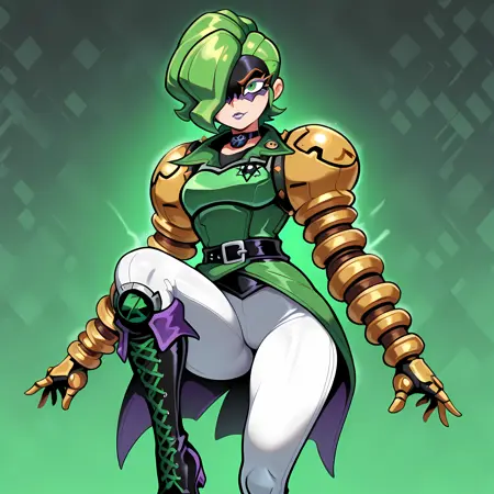 附加描述:绿色头发、绿色眼睛、紫色嘴唇、头发遮住一只眼睛、多米诺面具、妆容、项圈、银色长裤、绿色夹克、及膝靴、交叉系带鞋、机械臂