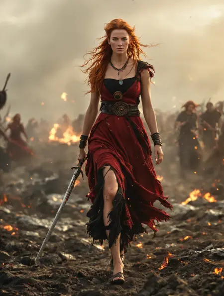 此LoRA以弗蕾亚为核心,她是北欧神话中掌管爱情、美丽、战争、魔法与死亡的女神,以对神话传统的深刻尊重与高度写实的视觉精度重新诠释。她拥有标志性的红褐色秀发,常自然飘逸或编织成发辫,饰以花朵、珠子和金线,彰显其神圣优雅与尘世联结。她的面部表情从宁静 radiant 到威严悲怆,映射出其作为生命与死亡之神的复杂性。