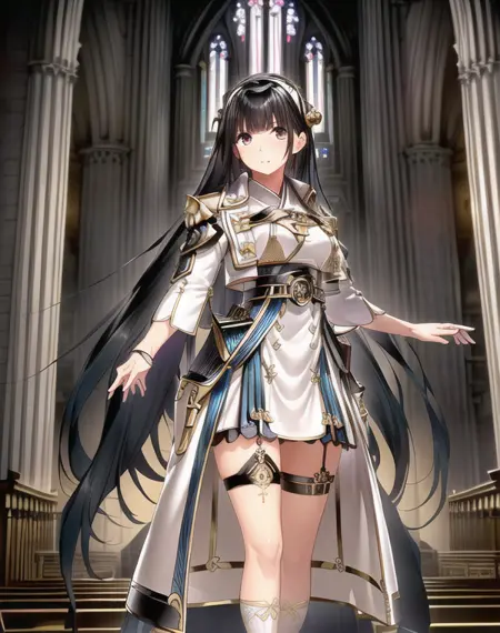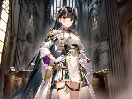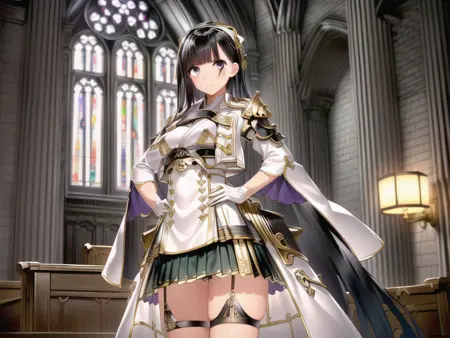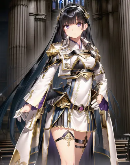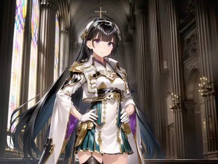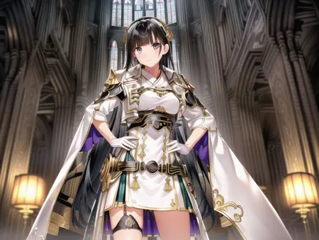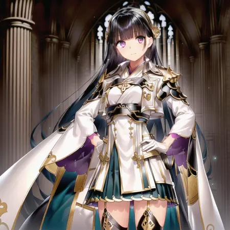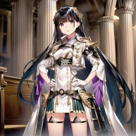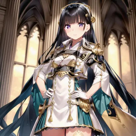 Edo,black hair, long hair, straight hair,hairband, white japanese clothes,wide sleeves,white sleeves,white gloves,green skirt, one thigh strap,