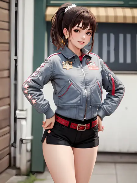提示词:长袖,黑眼,红腰带,星(符号),牛仔,短裤,黑发,耳环,牛仔夹克,靴子,棕眼,马尾,短裤,腰带,夹克,棕发,