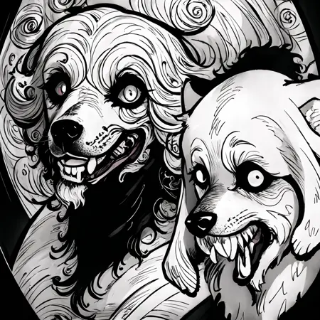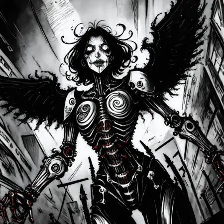 이것은 또 다른 내 호러 스타일입니다. 이 시점에서 제 오랜 팔로워들은 어떤 기대를 할지 알고 있습니다—LoRA만 적용하면 됩니다. "준지 이토 스타일"이나 "팀 버튼 스타일" 같은 태그는 스타일을 더욱 강화합니다.