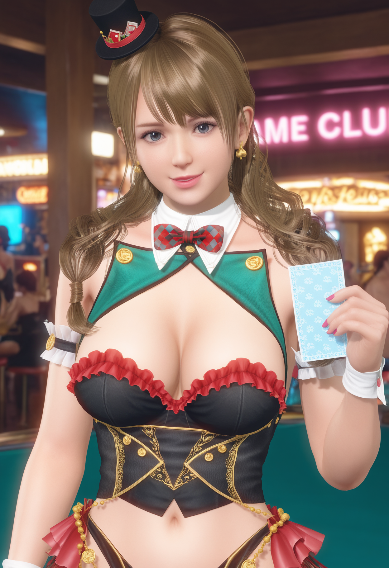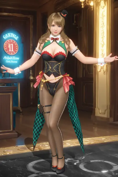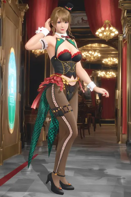 ofroyalflush,白色可拆卸领子,红黑格纹蝴蝶结,金色纽扣(扣件),无肩带金色镶边红色荷叶边黑色兔女郎连体衣,胸部挖空,腹部挖空,红色荷叶边腰围披风,绿黑格纹后摆,金色腰链,白色荷叶边臂环,白色腕套,黑色渔网袜,黑色大腿带,黑色大腿包,黑色玛丽珍高跟鞋,金色扣环,红色鞋带装饰,