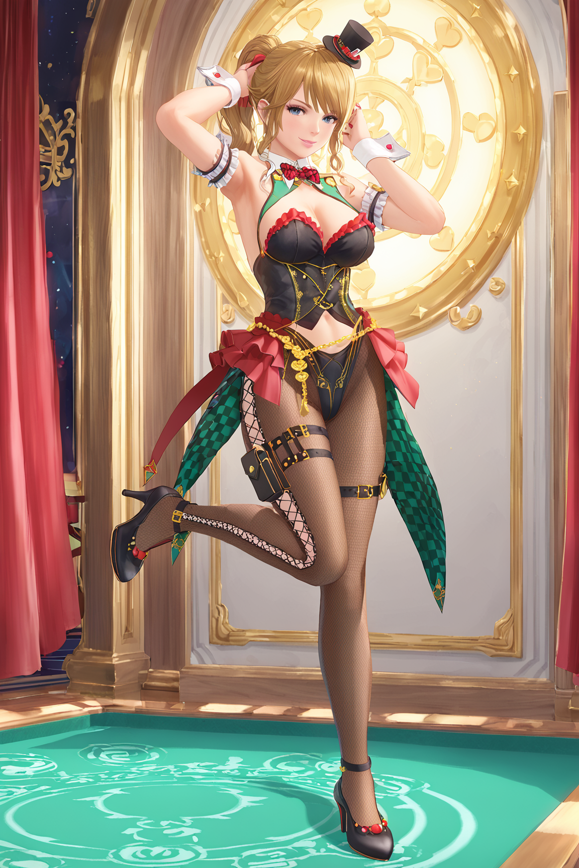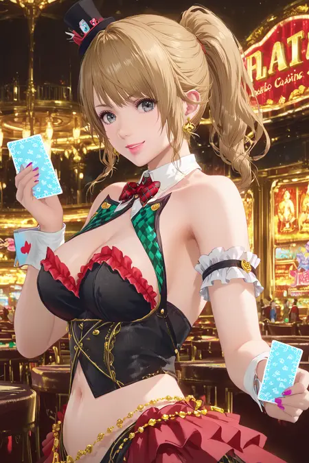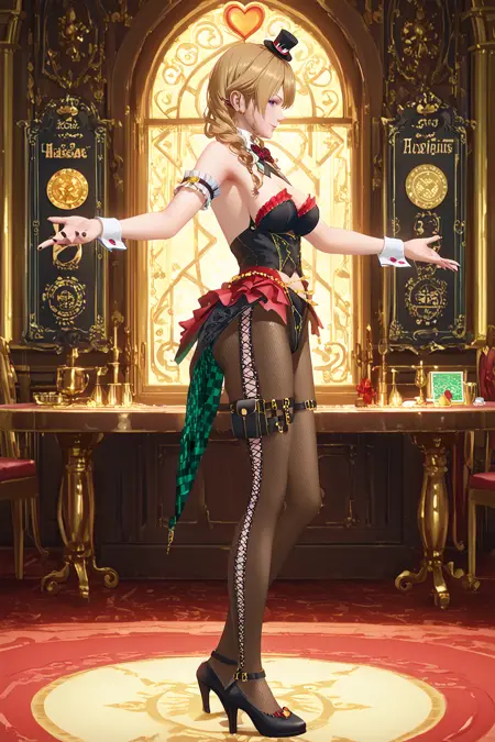 配饰:倾斜的黑色小礼帽、红色帽带、帽上为红心 A、帽上为红色图案纸牌背面、帽上装饰筹码,