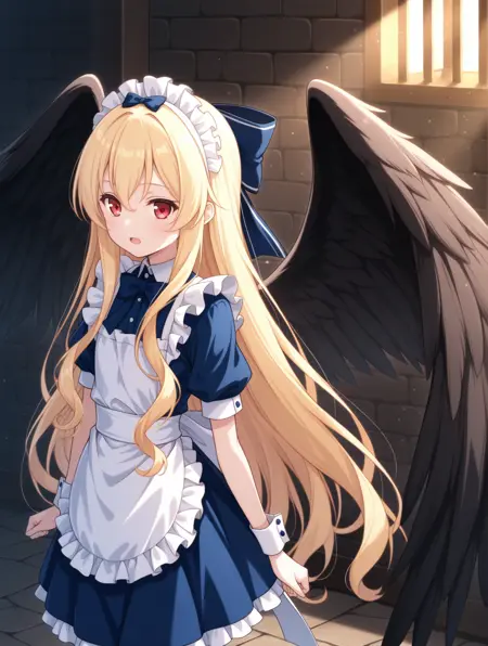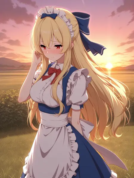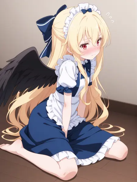 メイド、青いスカート、髪のリボン