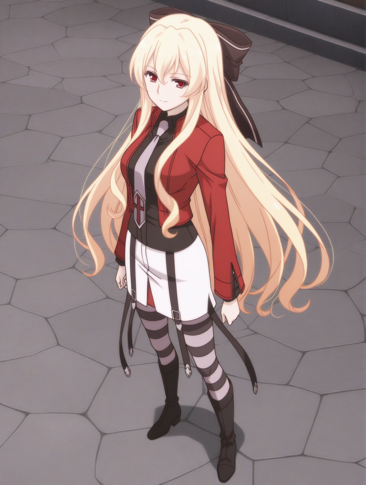 赤いジャケット、ネクタイ、黒いシャツ、白いスカート、縞模様のタイツ、黒いブーツ