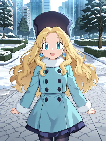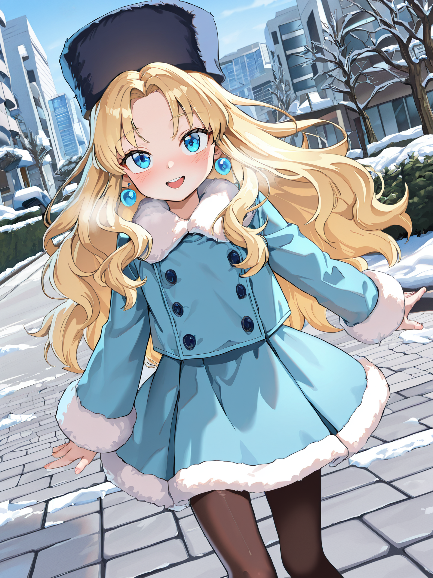 파란 코트, 모피 트림, 단추, 긴 소매, 파란 치마, 팬티스타킹