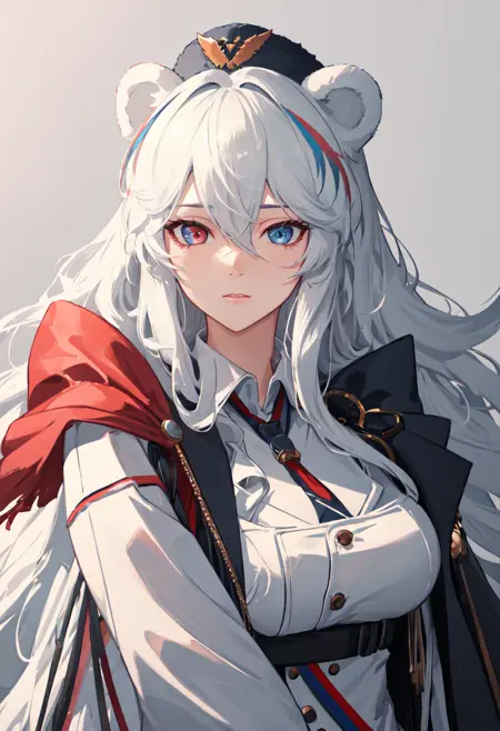 The trigger word is rosa_arknights, and the pruned tags are animal_ears, bear_ears, long_hair, white_hair, blue_eyes, heterochromia, multicolored_hair, streaked_hair, blue_hair, red_eyes, very_long_hair, hat, breasts, hair_between_eyes, blue_headwear, large_breasts. When some features (e.g. hair color) are not so stable at some times, you can add these them into your prompt.